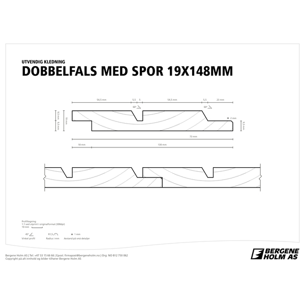 Dobbelfals med Spor er falset, høvlet med en rett side og en 60° skrå på den andre, samt et rett spor i midten. Dobbelfals med Spor monteres ofte liggende. Brukes ofte på moderne hus og hytter. Kledning i gran, behandlet med en hvit dekkende vanntynnbar alkyd-/akrylgrunning som påføres på 3 sider av bordet. Grunningen er diffusjonsåpen, værbestandig og inneholder soppdrepende midler. Anbefales overmalt senest innen 2 år Denne varen er produsert i Norge og er PEFC-sertifisert for garantert bærekraftig tre og har lang levetid ved riktig bruk. Livsløpsanalyse, påvirkning på miljø og lagring av karbon er dokumentert gjennom EPD og EcoProduct.