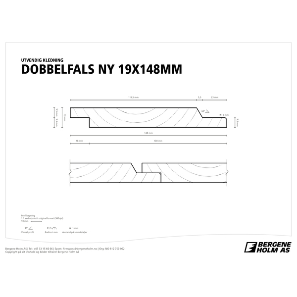 Dobbelfals Ny, også kalt Dobbelfals 60 grader, er falset og høvlet med en rett side og en 60° fas på den andre. Kledningen er endepløyd og monteres ofte liggende. En av Norges mest brukte kledningsprofiler. Kledning i gran, behandlet med en hvit dekkende vanntynnbar alkyd-/akrylgrunning som påføres på 3 sider av bordet. Grunningen er diffusjonsåpen, værbestandig og inneholder soppdrepende midler. Anbefales overmalt senest innen 2 år Denne varen er produsert i Norge og er PEFC-sertifisert for garantert bærekraftig tre og har lang levetid ved riktig bruk. Livsløpsanalyse, påvirkning på miljø og lagring av karbon er dokumentert gjennom EPD og EcoProduct.