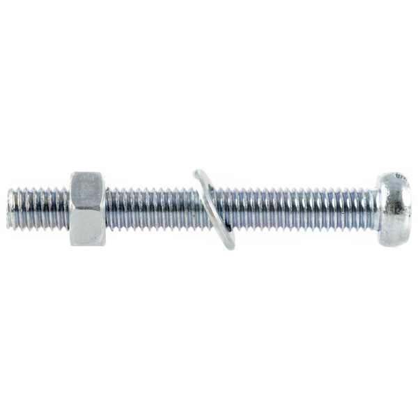 Maskinskrue, helgjenget DIN84 m/mutter og skive. Syrefast/A4 og sylinderhode. Kvalitet 4.8. Bruksområde: Sammenskruinger, tre mot tre, stål mot stål og i beslag. Korrosjonsklasse: C5 – Utendørs: (Industri) Industri og kyststrøk med høy fuktighet og aggressiv atmosfære. (Marin) Kyst og havsstrøk med høyt saltinnhold. Innendørs: Bygninger med nesten konstant kondensasjon og sterkt forurenset atmosfære.