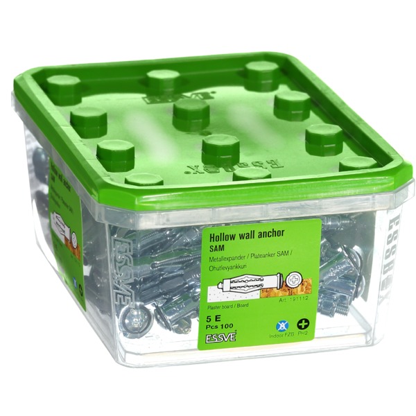 ESSVE Plateanker SAM er beregnet for montering i alle typer platematerialer, som gips-, spon-, og trefiber-, plast- og laminatplater. Maks 45 mm