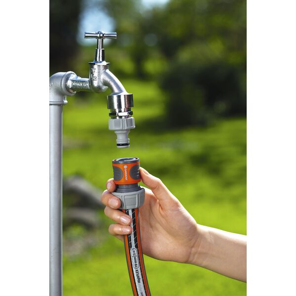 GARDENA Slangekobling 3/4″ uten stopp gjør det enkelt å koble slangen til vannkranen, eller til andre vanningsenheter. Koblingen festes på begynnelsen av hageslangen, og den passer til slanger med diameter på 19 mm 3/4″. Slangekoblingen er beskyttet med en gummiring for å forhindre skade, og myke plastdetaljer med riller sikrer godt grep, selv med våte hender. Slangekoblingen er utstyrt med Power Grip, en spesialformet låsemutter som sikrer en pålitelig kobling med sterk holdekraft, samt enkel montering og høyt vanntrykk. Koblingen er frostsikker og påvirkes ikke av temperaturer under 0 grader. Den er fremstilt i materialer av høy kvalitet, og produsert i Tyskland. Produktet leveres med 5 års garanti.
