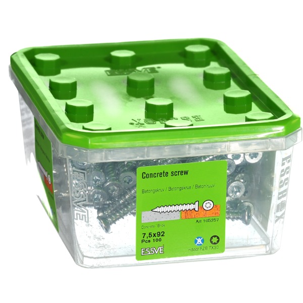 ESSVE Betongskrue er en spesialherdet skrue beregnet for rask og enkel forankring i betong, tegl, hulltegl og hulldekkelement. Betongskruen dras direkte inn i et forboret hull, uten plugg. Skruen er helgjenget med en såkalt «hi-low» gjenge, som forenkler monteringen. Skruen er produsert av herdet stål med blankforsinket overflatebehandling.