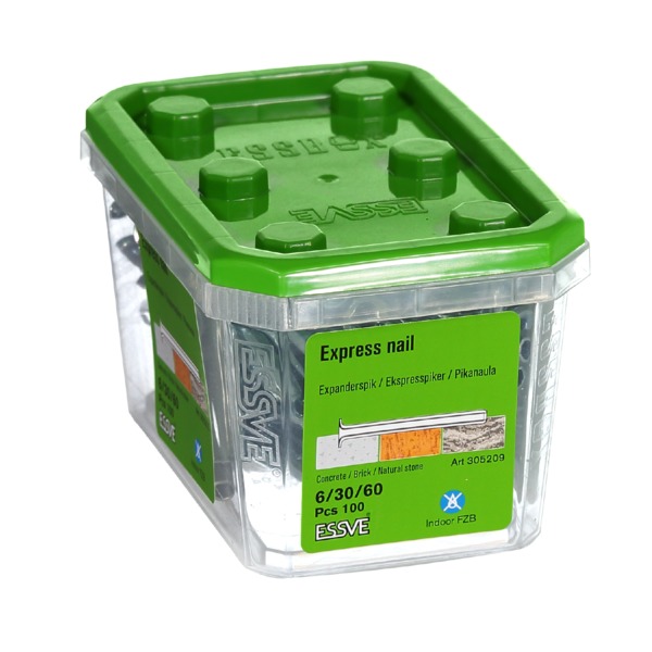 ESSVE Ekspress spiker er beregnet for enklere montasjer og for gjennomstikksmontering i betong, tegl eller naturstein. Ekspress spiker egner seg der det stilles krav til brannsikkerhet på innfestning eller der det ønskes kort forankringsdybde. Ekspress spiker brukes f.eks ved montering av stål- og trelekter i underkant av bjelkelag og som spikerlekt for himlinger, etc.