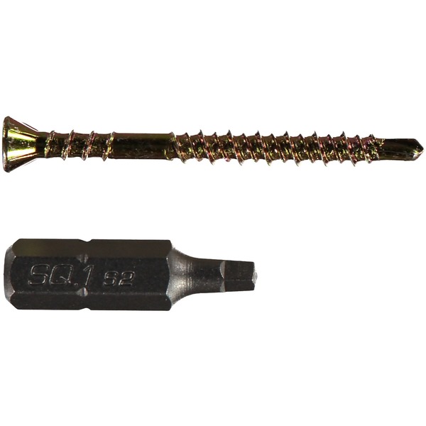 Skruen er produsert av herdet stål med gulkromatisert overflatebehandling, og har et firkantbits nr R1 i ESSBOX forpakning.