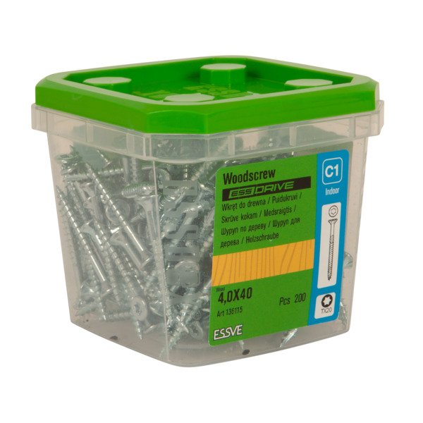 Treskrue ESSDRIVE for montering og sammenføyning av trevirke, innendørs. Skruens patenterte spiss sørger for at skruen griper umiddelbart. Hodeformen gir en perfekt finish uten sprekker eller fliser. Fresespor på stammen gir et lavt innskruingsmoment og økt klemkraft. Skruer 70mm eller lenger har et ekstra fresespor etter hovedgjengen, som bidrar til mindre motstand og lettere montering. Skruen fungerer godt med forsenkede hull i de fleste typer braketter. ESSDRIVE er spesielt god i vanskelige, unaturlige posisjoner hvor skuldre og ledd får uønsket belastning. ESSDRIVE er produsert av sterkt og fleksibelt blankforsinket stål med TX-spor, korrosjonsklasse C1. CE-merket i hht. EN14592. Anbefalt turtall: 400-1200/min