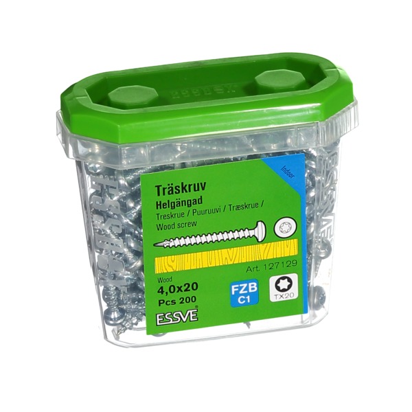 ESSVE Treskrue, helgjenget, med panhode passer for de fleste monteringer i tre, sponplater, kryssfiner, plast, mm innendørs. Skruen er produsert av herdet stål med blankforsinket overflatebehandling for innendørs bruk, har 1 fiberskjær i spissen, og TX bitsfeste.
