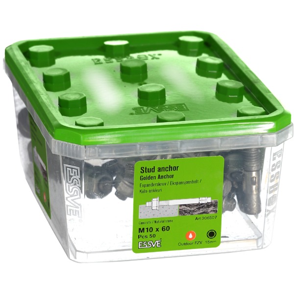 ESSVE Ekspansjonsbolt Golden Anchor er beregnet for innfestning i betong og naturstein. Ekspansjonsankeret kan med fordel brukes i applikasjoner der det stilles høye krav til innfestningen. Golden Anchor kan brukes til å feste tre-/stålstendere ved reisverk, feste av beslag, z-jern, armeringer etc.