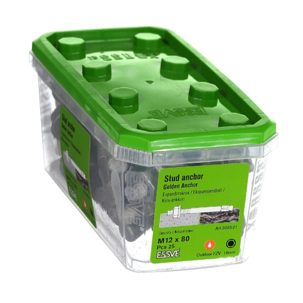ESSVE Ekspansjonsbolt Golden Anchor er beregnet for innfestning i betong og naturstein. Ekspansjonsankeret kan med fordel brukes i applikasjoner der det stilles høye krav til innfestningen. Golden Anchor kan brukes til å feste tre-/stålstendere ved reisverk, feste av beslag, z-jern, armeringer etc.