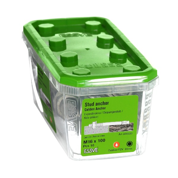 ESSVE Ekspansjonsbolt Golden Anchor er beregnet for innfestning i betong og naturstein. Ekspansjonsankeret kan med fordel brukes i applikasjoner der det stilles høye krav til innfestningen. Golden Anchor kan brukes til å feste tre-/stålstendere ved reisverk, feste av beslag, z-jern, armeringer etc.