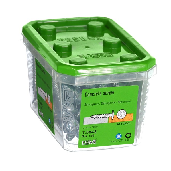 ESSVE Betongskrue er en spesialherdet skrue beregnet for rask og enkel forankring i betong, tegl, hulltegl og hulldekkelement. Betongskruen dras direkte inn i et forboret hull, uten plugg. Skruen er helgjenget med en såkalt «hi-low» gjenge, som forenkler monteringen. Skruen er produsert av herdet stål med blankforsinket overflatebehandling.