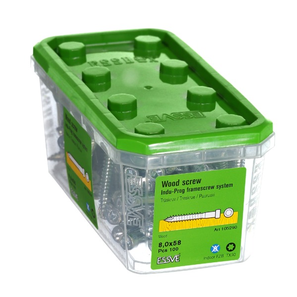 ESSVE Indu-Prog Treskrue brukes til montering av Indu-Prog Karmhylse mot trestender. Anbefales til tyngre og klassifiserte monteringer. Skruehodet er utstyrt med TX-feste/bits, TX30.