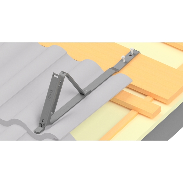 Snøkonsoll for montering av LOBAS snøfangersystem på betongstein, skiferstein, falset teglstein og ufalset teglstein. Konsollen er nøye tilpasset gittergelender som monteres skrueløst og svært enkelt ved hjelp av medfølgende klemme. Avstand mellom konsollene bestemmes av takets overflate, grader på taket og snølast for området.