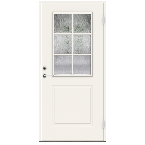 Swedoor P-400 ytterdørsett 9×21 Venstre malt hvit NCS S0502-Y med cotswold glass. Dette er en enkel ytterdør i vår clever-line serie som har en lett konstuksjon (EPS kjerne) og som oppfyller de grunnleggende behovene når du ikke trenger ekstra funksjoner.
