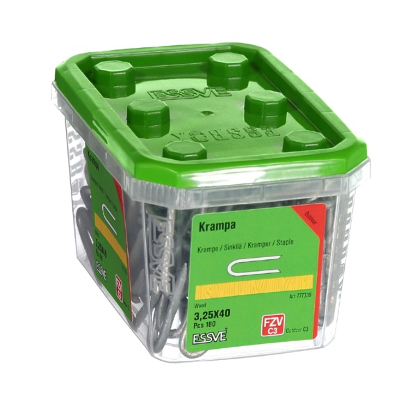 ESSVE Krampe FZV er beregnet for oppsetting av porter, tråd, nett m m. utendørs der det forekommer krav til rustbeskyttelse.