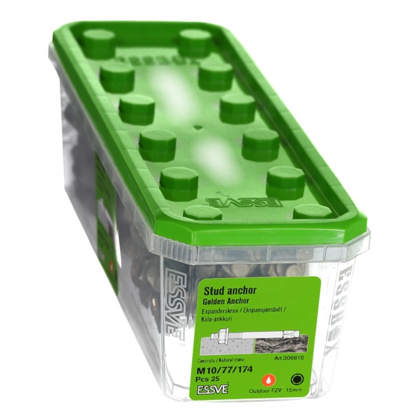 ESSVE Ekspansjonsbolt Golden Anchor er beregnet for innfestning i betong og naturstein. Ekspansjonsankeret kan med fordel brukes i applikasjoner der det stilles høye krav til innfestningen. Golden Anchor kan brukes til å feste tre-/stålstendere ved reisverk, feste av beslag, z-jern, armeringer etc.