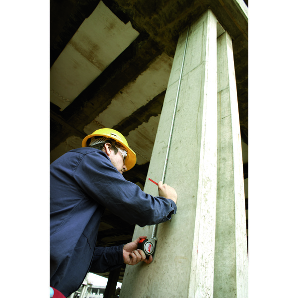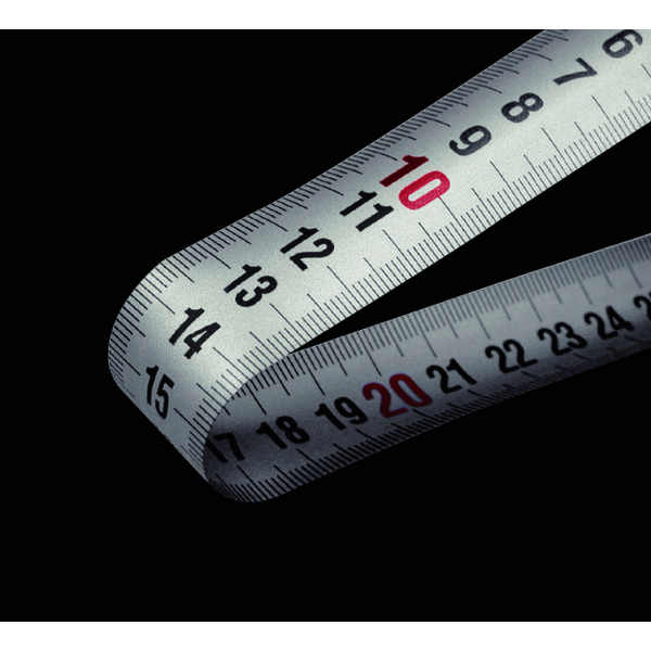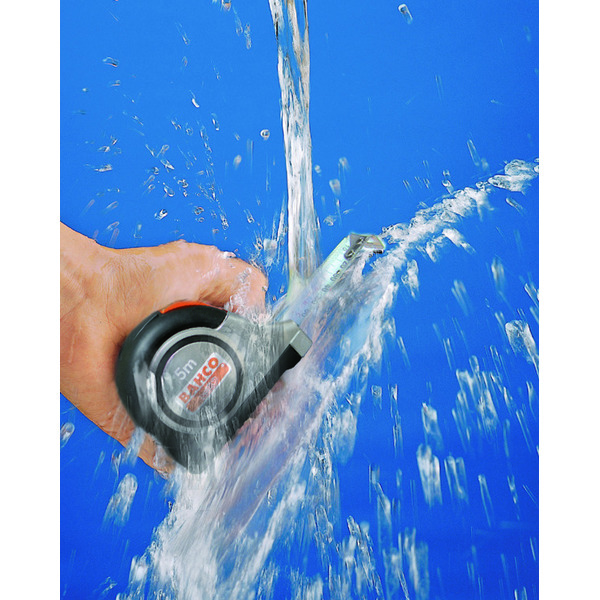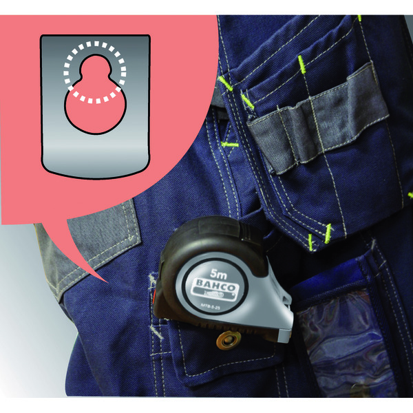 5 meter langt presisjonsmålebånd i klasse 2 med tydelige, permanente merker på begge sider. Støtdempende gummimateriale. Båndet forblir ute inntil inntrekkingsknappen brukes. Blendefritt bånd i rustfritt stål med doble nylonlag og magnetisk tupp. Integrert belteklemme.