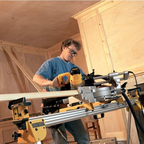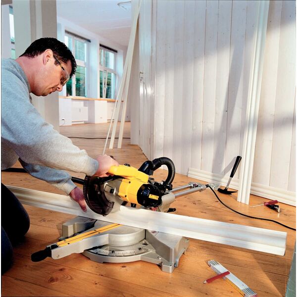 DEWALT Robust innrednings sag 1600W. Sag med stor nøyaktighet. 216mm blad. Uttrekk for større kapasitet, 300×70 mm ved 90/90gr. Gjæring 60/50gr (h/v). Stabilt aluminiumsåle med tydelige stopp markeringer.