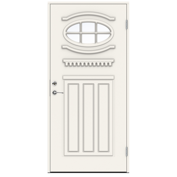 Swedoor Mozart ytterdørsett 9×21 Venstre malt hvit NCS S0502-Y med klart glass. Dette er en ytterdør i vår ADVANCE-LINE Classic serie inspirert av klassisk arkitektur fra tidlig 1900-tall. Det historiske uttrykket er kombinert med en moderne konstruksjon som har solide glasslister uten skjøter og spiker, noe som understreker dørens vakre utseende og gir økt sikkerhet mot innbruddsforsøk.