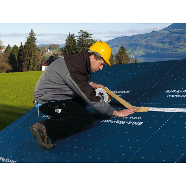 WIGLUV 60 til utvendig vindtetting. Toppytelsestape med en klebeside til omleggsskjøter, gjennomføringer og vinduer. Diffusjonsåpen spesial-duk av PO, kan rives med hånd, (sd-verdi < 2 m), elastisk, vanntett, UV-stabil (direkte værpåvirkning opptil 12 måneder) Egnet for midlertidig dekking/nødtak.