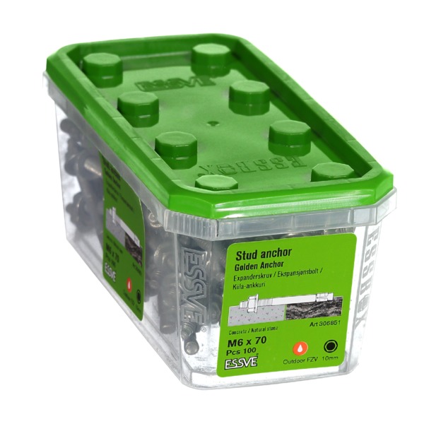 ESSVE Ekspansjonsbolt Golden Anchor er beregnet for innfestning i betong og naturstein. Ekspansjonsankeret kan med fordel brukes i applikasjoner der det stilles høye krav til innfestningen. Golden Anchor kan brukes til å feste tre-/stålstendere ved reisverk, feste av beslag, z-jern, armeringer etc.