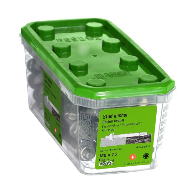 ESSVE Ekspansjonsbolt Golden Anchor er beregnet for innfestning i betong og naturstein. Ekspansjonsankeret kan med fordel brukes i applikasjoner der det stilles høye krav til innfestningen. Golden Anchor kan brukes til å feste tre-/stålstendere ved reisverk, feste av beslag, z-jern, armeringer etc.