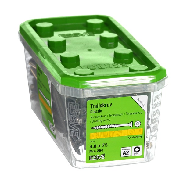 ESSVE Terrasseskrue Classic har fiberskjær i spissen som hindrer sprekkdannelse. CE-merket. Rustfri A2 brukes til terrasser, rekkverk og gjerder i miljøer med moderat saltinnhold.