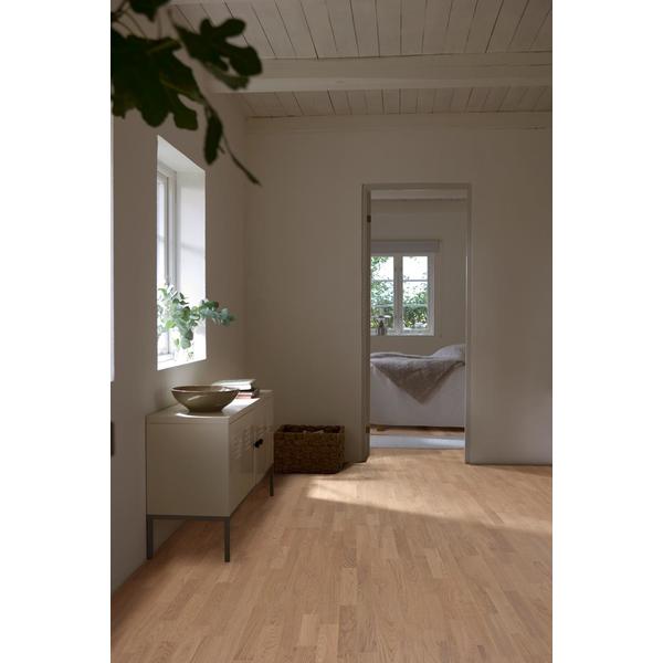 Eik Abetone er et 3-stavs parkettgulv med mindre naturlige fargevariasjoner og små kvister. Gulvet er hvitlasert og med matt lakk.