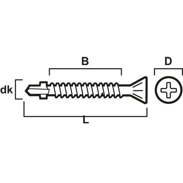 Skruen er produsert av herdet stål med CorrSeal overflatebehandling, klasse C4. En borende og gjengepressende skrue med fresevinger for frigangsboring i myke materialer. Hodet har skjærende riller som forsenker hodet ved montering. Skruen har krysspor Ph2, Ph3 eller TX, avhengig av dimensjon.