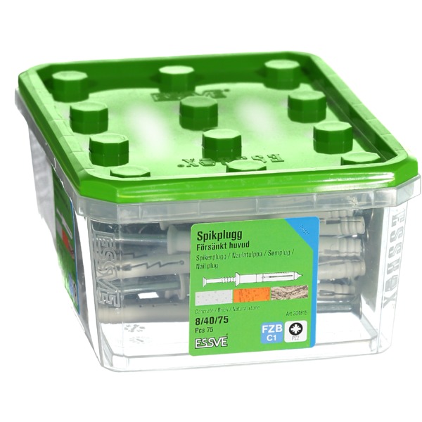 ESSVE Spikerplugg er beregnet for lettere montering av trelekter, sokler, kledning, innredningsdetaljer, skap mm. i materiale som betong, tegl, naturstein, eller hulldekkelement.
