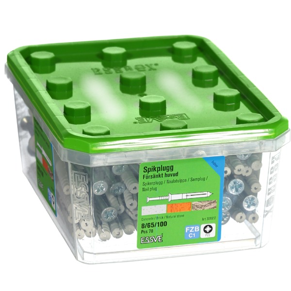 ESSVE Spikerplugg er beregnet for lettere montering av trelekter, sokler, kledning, innredningsdetaljer, skap mm. i materiale som betong, tegl, naturstein, eller hulldekkelement.