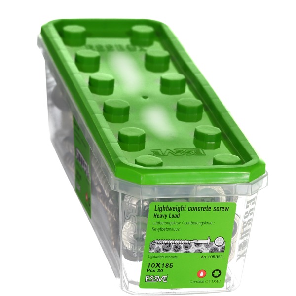 ESSVE Lettbetongskrue brukes til forankring i porøse materialer som lettbetong, Leca, Siporex etc. Lettbetongskruen er utviklet for å tåle nordisk klima og tung montasje ved stendermontering av tre- og stålstender, sviller, feste av isolasjonsmateriale etc. Lettbetongskruens gjenge er spesielt designet for porøse materiale som lettbetong. Skruen har skjærende riller for å redusere risikoen for overtrekking samt raskere forsenking i tre.