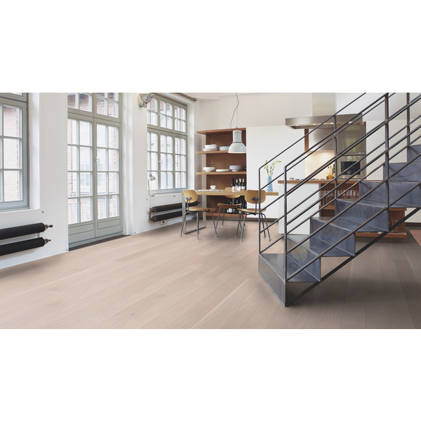 Eik Pearl 138 mm plank, gulvet skinner nesten som perlemor. Den hvite pigmenteringen får spillet i treverket til å leve i takt med skiftende lys. Et røft fargespill, inneholder kvist. Plankene i den klassiske bredden på 138 mm gir et stilrent, elegant og klassisk utseende. Parketten er behandlet med naturolje. Oljen inneholder bare naturlige ingredienser som oljer fra solsikke, tistel og soyabønne og naturlig voks (karnauba og candelilla) og gir svært god beskyttelse mot væsker, samt forbedret UV-stabilitet. For å forbedre slitestyrken anbefaler vi ett strøk med Boen Natural Oil før gulvet tas i bruk, deretter Boen Freshen Up for vedlikehold av mer trafikkerte områder. Husk matchende gulvlister for å skape helhet og et eksklusivt utseende. 5G Click system. Velegnet for gulvvarme.
