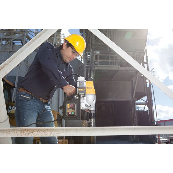 DEWALT Drill 1200W, stasjonær. 10 ampere motor og 2 hastighetsinnstillinger gir optimal ytelse i en rekke bruksområder. Overbelastningsbeskyttelse motorskade og overflødig tilbehørsslitasje. 0-spenningsbryter. Borer opp til 50 mm hull i 50 mm stål. Hurtigskifte chucksystem gir mulighet for verktøyfri veksling mellom 3/4″ Weldon Shank og 1/2″ nøkkelchuck.