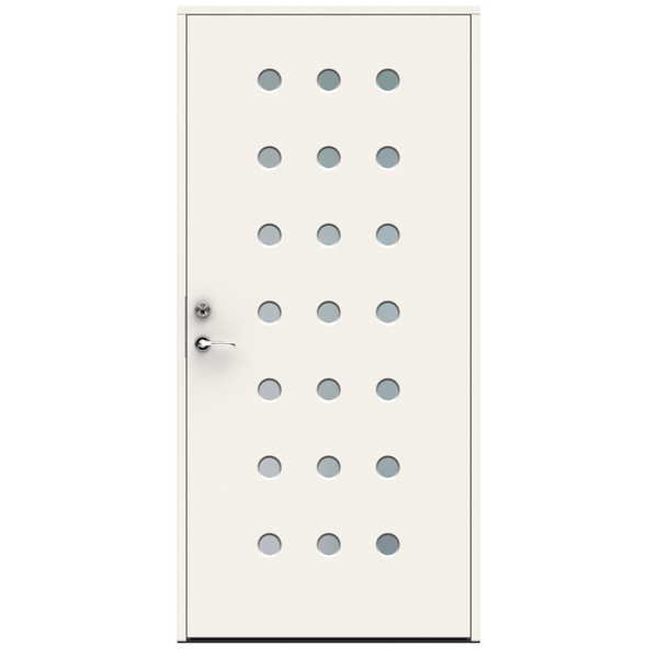 Swedoor Domino ytterdørsett 9×21 Venstre malt hvit NCS S0502-Y bomull med klart glass. Dette er en ytterdør i vår ADVANCE-LINE Character serie som med sin unike glassåpning uten listverk og skruer har satt en ny standard for rene linjer. Dørenes design, skjulte hengsler, massiv konstruksjon og patenterte konstruksjonsløsninger bidrar også til den eksklusive følelsen som Character formidler.