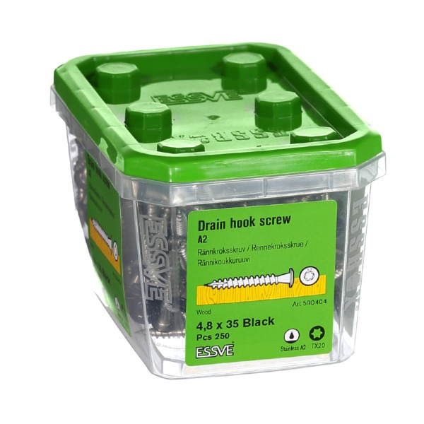 ESSVE Takrenneskruer er beregnet for montering av takrenner mot underlag av tre. Monteres direkte i forborede hull på takrennen. Skruen er produsert i rustfritt stål A2. Den er tilgjengelig i fargene sort, hvit, sølv og ulakkert. Skruen har et fibercut i spissen for å minimere innskruingsmoment og sprekkdannelser, og utstyrt med TX-bits.