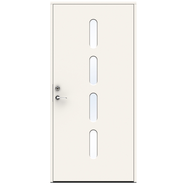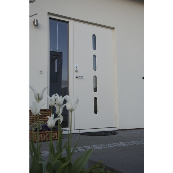 Swedoor Beat ytterdørsett 9×21 Venstre malt hvit NCS S0502-Y bomull med klart glass. Dette er en ytterdør i vår ADVANCE-LINE Character serie som med sin unike glassåpning uten listverk og skruer har satt en ny standard for rene linjer. Dørenes design, skjulte hengsler, massiv konstruksjon og patenterte konstruksjonsløsninger bidrar også til den eksklusive følelsen som Character formidler.
