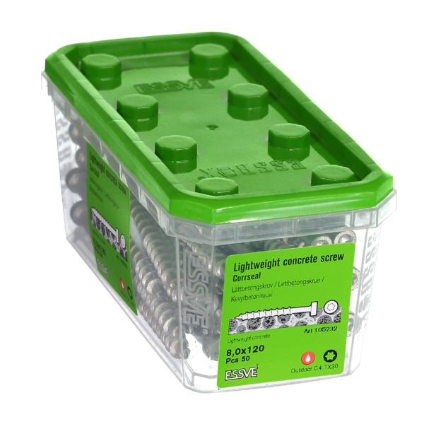 ESSVE Lettbetongskrue brukes til forankring i porøse materialer som lettbetong, Leca, Siporex etc. Lettbetongskruen er utviklet for å tåle nordisk klima og tung montasje ved stendermontering av tre- og stålstender, sviller, feste av isolasjonsmateriale etc. Lettbetongskruens gjenge er spesielt designet for porøse materiale som lettbetong. Skruen har skjærende riller for å redusere risikoen for overtrekking samt raskere forsenking i tre.