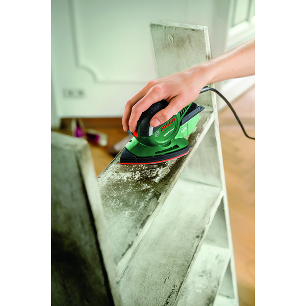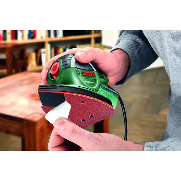 Denne kompakte multisliperen er perfekt til slipearbeid og reparasjoner på vanskelig tilgjengelige steder. PSM Primo er designet for komfortabelt arbeid på vanskelig tilgjengelige steder, i hjørner, på kanter og på mindre, plane flater. Et borrelåssystem sørger dessuten for raskt og enkelt bytte av slipepapiret, mens microfilter-støvboksen samler opp støv og holder arbeidsområdet rent. Denne multisliperen er egnet for arbeid på hardt og mykt tre, lakkerte og malte flater, metall og stein, og klarer mindre oppgaver og reparasjoner som arbeid på møbler, dører, karmer, hyller og treleker.