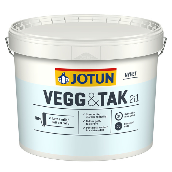 VEGG OG TAK 2 i 1 er en matt maling som kan brukes i tak og på vegg. Gjør malerjobben effektiv.