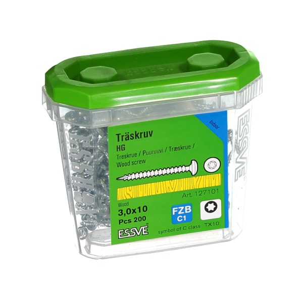 ESSVE Treskrue, helgjenget, med panhode passer for de fleste monteringer i tre, sponplater, kryssfiner, plast, mm innendørs. Skruen er produsert av herdet stål med blankforsinket overflatebehandling for innendørs bruk, har 1 fiberskjær i spissen, og TX bitsfeste.