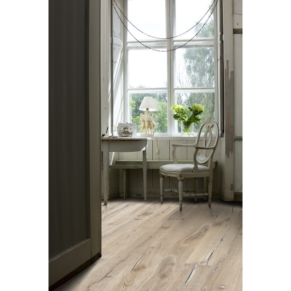 Eik Aspeland er et veldig rustikt 1-stavs plankegulv med store kvister og sprekker som gir gulvet et gammelt utseende. Overflatebehandlet med en hvitpigmentert olje. Kraftig børstet, håndskrapet, sagmerker for den unike overflaten og med fasede kanter. 15mm. Tidens tand med lyse farger inspirert av mel og brød – Skal installasjonsoljes med Kährs Satin Oil Matt rett etter legging. Er tilpasset relativ luftfuktighet(RF) 20 – 60 % og kan kombineres med gulvvarme. Husk riktig leggeverktøy og parkettunderlag. Kahrs leverer matchende gulvlister, nivålister, T-lister, avslutningslister og trappeneser til de fleste gulvene.