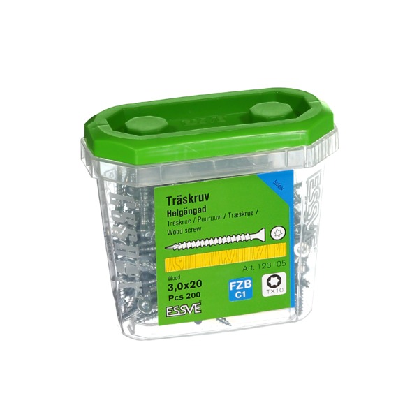 ESSVE Treskrue helgjenget med senkhode er egnet for de fleste monteringer i tre, sponplater, kryssfiner, plast, mm innendørs. Skruen er produsert av herdet stål med blankforsinket overflatebehandling for innendørs bruk. Skruen har et fiberspor i spissen som gir skruen et lavt innskruingsmoment og minimerer risikoen for sprekkdannelser.