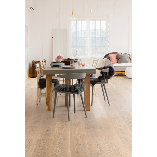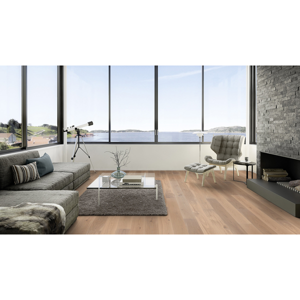 Eik hvit Animoso 209 mm plank har en behagelig matt og lys fargetone som skaper en jordnær og typisk skandinavisk stemning. Et røft fargespill, inneholder kvist. Plankene i den uvanlige bredden på hele 209 mm gir et eksklusivt utseende. Parketten er behandlet med naturolje. Oljen inneholder bare naturlige ingredienser som oljer fra solsikke, tistel og soyabønne og naturlig voks (karnauba og candelilla) og gir svært god beskyttelse mot væsker, samt forbedret UV-stabilitet. For å forbedre slitestyrken anbefaler vi ett strøk med Boen Natural Oil før gulvet tas i bruk, deretter Boen Freshen Up for vedlikehold av mer trafikkerte områder. Husk matchende gulvlister for å skape helhet og et eksklusivt utseende. 5G Click system. Velegnet for gulvvarme og nordisk klima.