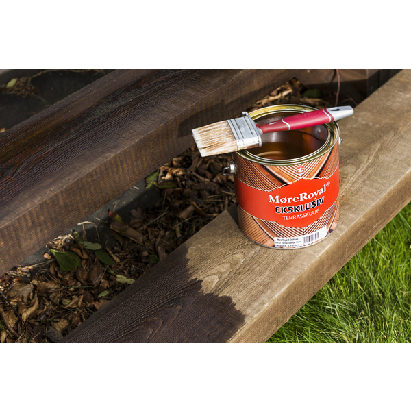 MøreRoyal oljer er spesielt utviklet for vedlikehold av MøreRoyal, og leveres i samme farger som fargepaletten på materialene. MøreRoyal Treolje benyttes til etterbehandling av MøreRoyal kledning og tretak, samt til kappflater. Husk å olje alle kappflater for å forhindre fuktinntrengning i treet. MøreRoyal Eksklusiv Terrasseolje benyttes til etterbehandling av MøreRoyal terrassebord og dekke.