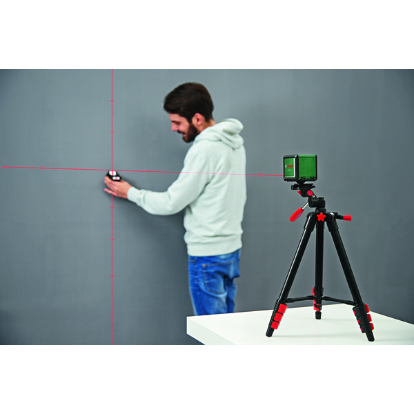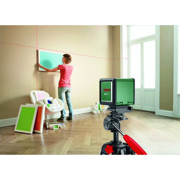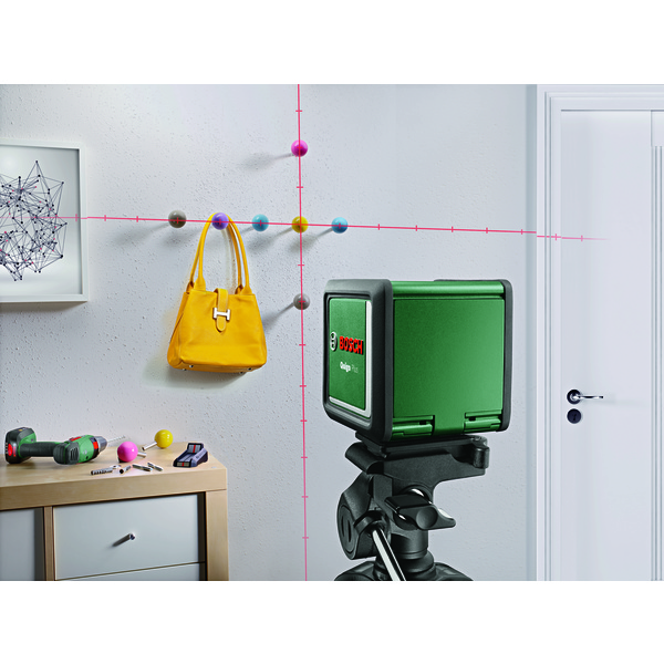 Quigo Plus er den ideelle hjelperen når du skal dekorere eller lage mønstre på veggen: Juster komplekse mønstre med like og ulike avstander ved hjelp av markeringene på laserlinjene. Laseren projiserer både horisontale og vertikale laserlinjer samtidig, som rettes automatisk opp selv om verktøyet befinner seg på litt ujevnt underlag. Opphenging av pyntegjenstander og bilder, montering av hyller, tapetsering eller flislegging gjøres enkelt og intuitivt ved hjelp av bare én bryter. Laseren har et selvnivellerende område på +/-4°, og et tripodstativ på 1,1 m er inkludert for nøyaktig høydejustering og allsidig plassering. Verktøyet leveres med 2stk AAA-batterier.