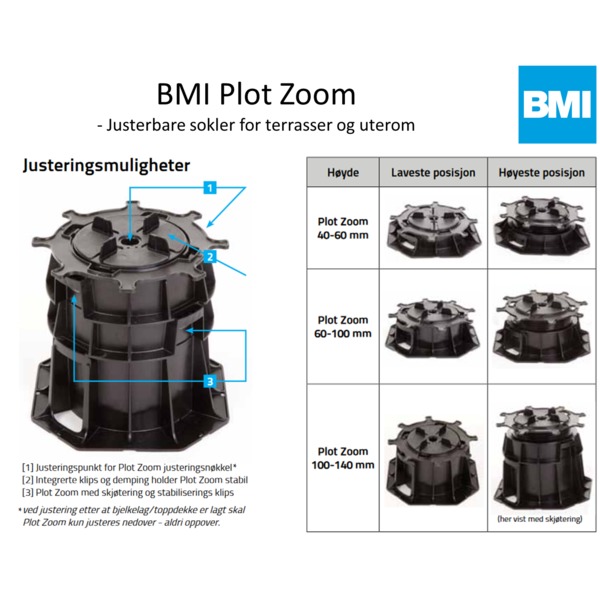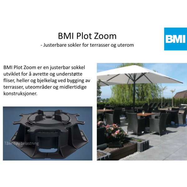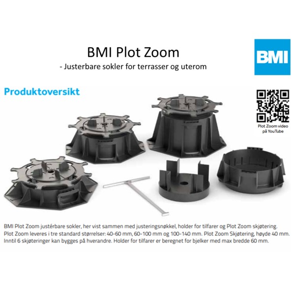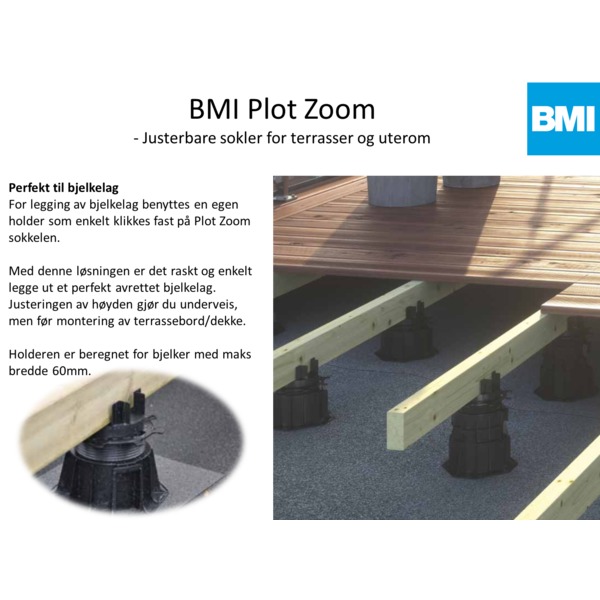 BMI Plot Zoom er en justerbar sokkel utviklet for å avrette og understøtte fliser, heller og bjelkelag ved bygging av f.eks terrasser, uteområder og midlertidige konstruksjoner. Plot Zoom er også velegnet til bruk innendørs for å skjule kabler, rør og installasjoner i gulv. For bruk under bjelkelag benyttes en egen holder som enkelt monteres på soklene. Plot Zoom leveres i tre standard størrelser, 40-60 mm, 60-100 mm og 100-140 mm. I tillegg kan inntil 6 skjøteringer benyttes, dette gir 240 mm ekstra byggehøyde. Dette gjør Plot Zoom velegnet også ved store nivåforskjeller i underlaget. Plot Zoom kan justeres både fra siden eller toppen (finjustering) med en justeringsnøkkel. Plot Zoom tåler en belastning på 15 kN regnet vertikalt på 100% av overflaten, og 7,5 kN på 25% av overflaten