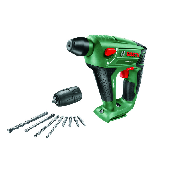 Den sterke og kompakte batteridrevne 3-i-1-borhammeren Uneo Maxx er konstruert for krevende hamring, boring og skruing i betong, mur, metall, tre og fliser. Med Bosch-trykklufthammermekanisme og en sterk motor, gis mulighet til rask og enkel boring inntil 10 mm i betong. Den har en SDS quick-chuck for enkelt bytte av alle 1/4″ sekskant- og SDS quick-bor på bare tre sekunder. Den kompakte kraftpakken på bare 1,4 kg er dessuten komfortabel å bruke på trange steder, og takler alle oppgaver fra boring i betong til presisjonsskruing i tre. Verktøyet hører med i POWER FOR ALL ALLIANCE, der ett batteri kan brukes på mange forskjellige verktøy av ulike merker. Batteri og lader medfølger ikke.