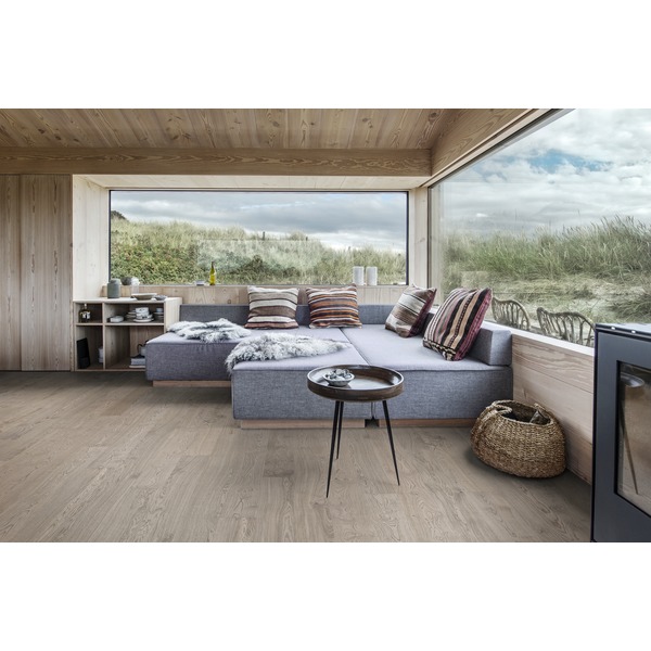 Grå tonene i dette 1-stavs eikegulvet i Lux Collection er fullt av subtile jordfarger, treffende komplettert med en ultra matt lakkert overflate. Med mikrofas på fire sider er uttrykket av en klassisk fullplank sikret. Hvert bord er forsiktig børstet til fullkommenhet for å få frem den naturlige karakteren i sorteringen. Den ultra matte lakk overflaten skaper inntrykk av nylig saget tømmer som effektivt eliminerer reflekser, samtidig som den beskytter treet mot daglig slitasje.