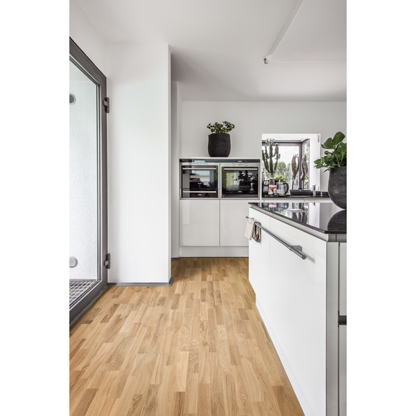 Eik Dawn et 3-stavs parkettgulv med ultramatt lakk, som ser og føles som nysaget tre.