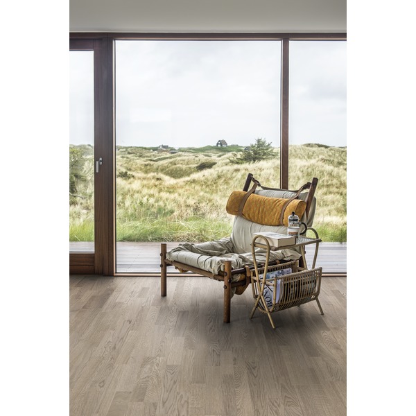 Eik Eclipse et 3-stavs parkettgulv, børstet, med ultramatt lakk, som ser og føles som nysaget tre. Grå.